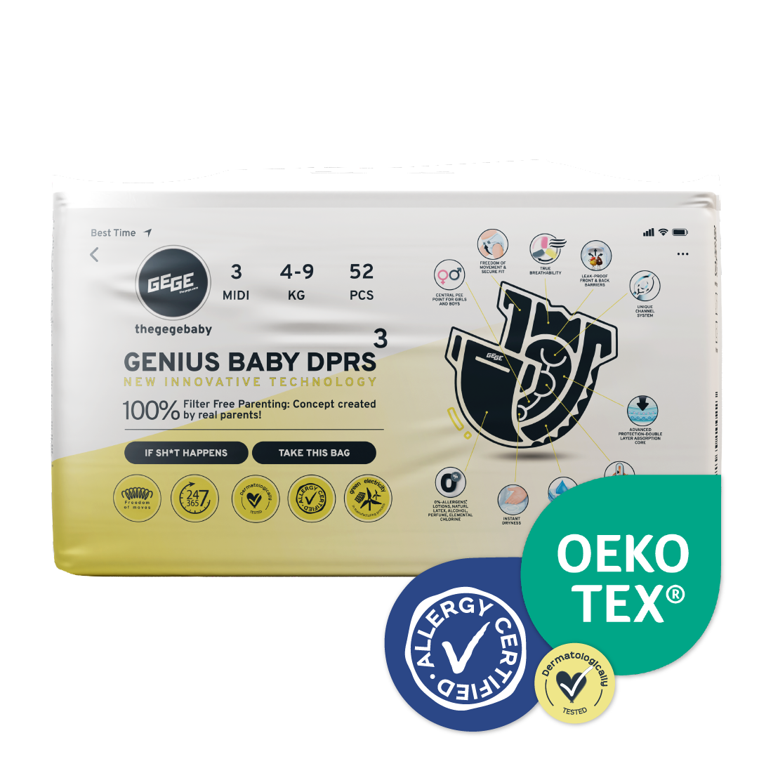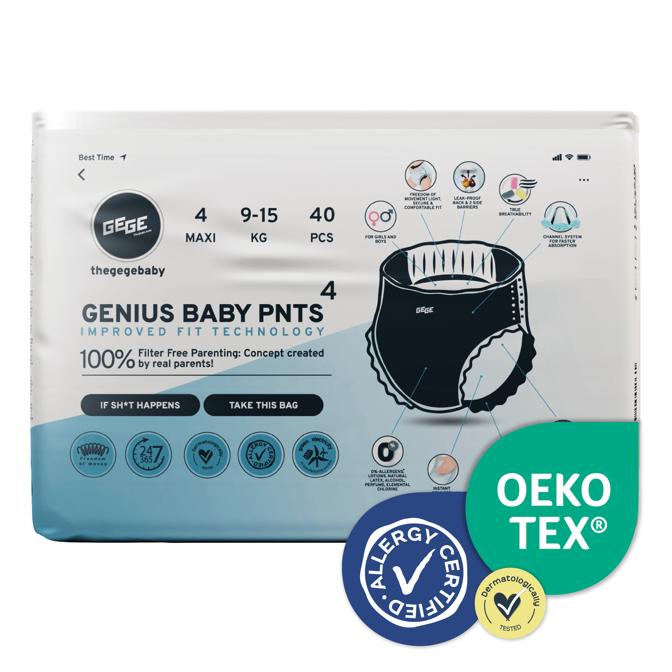 Šiuo metu naudojame Gege maxi 4 sauskelnes ir kelnytes. Pradėjome naudoti nuo 2 mėnesių, kai pasiekėme svorio ribą. Labai jas mėgstame, nes jos puikiai sugeria ir naktį jų keisti nereikia. Dizainas labai gražus ir išskirtinis, o mūsų mažyliui jos labai patinka